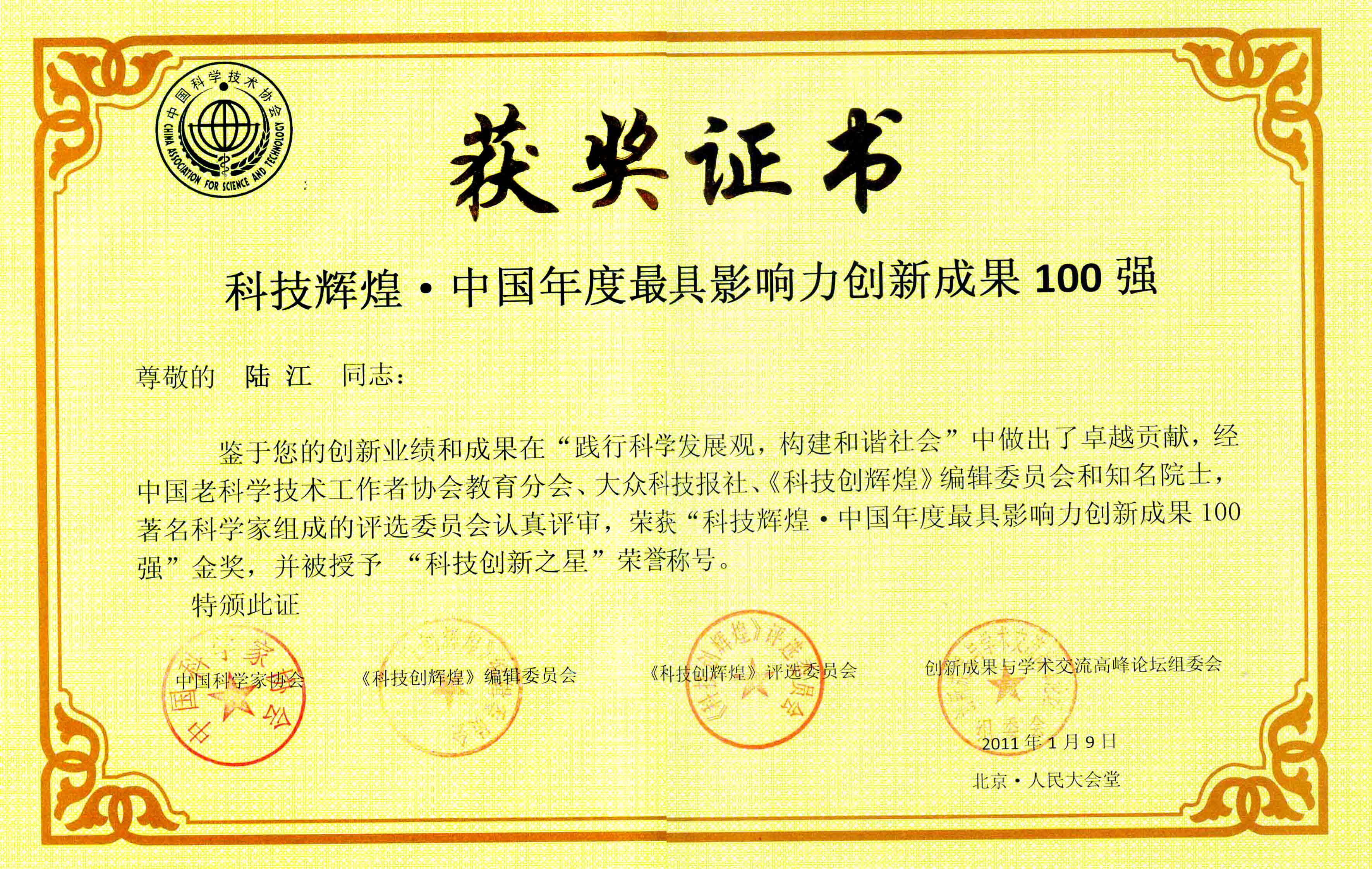陸江的論文獲一等獎(jiǎng)榮譽(yù)證書-- 陸江論文獲創(chuàng)新論文獎(jiǎng)牌